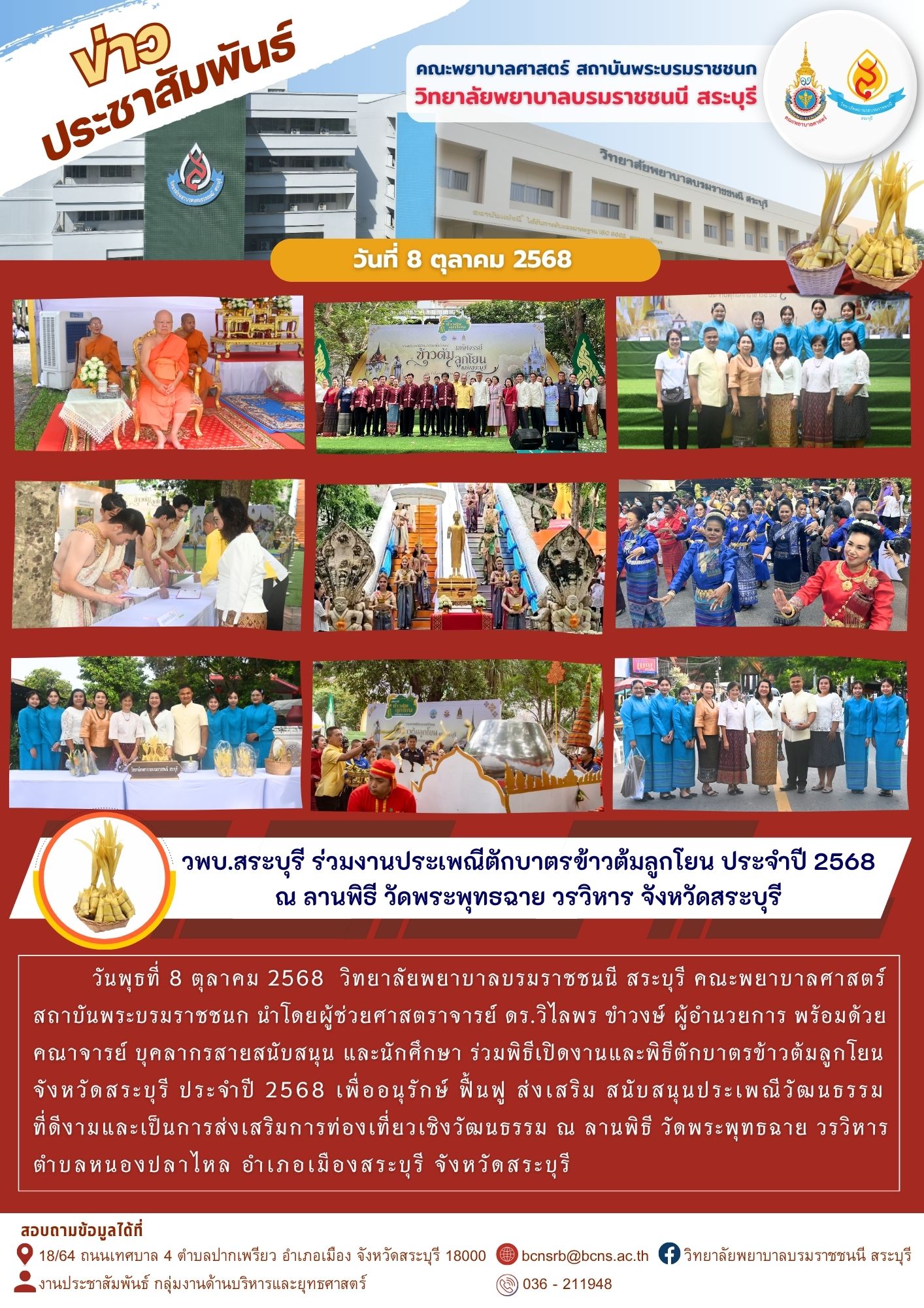 08 Oct 2025 วพบ.สระบุรี ร่วมงานประเพณีตักบาตรข้าวต้มลูกโยน ประจำปี 2568 ณ ลานพิธี วัดพระพุทธฉาย วรวิหาร จังหวัดสระบุรี อ่านเพิ่มเติม