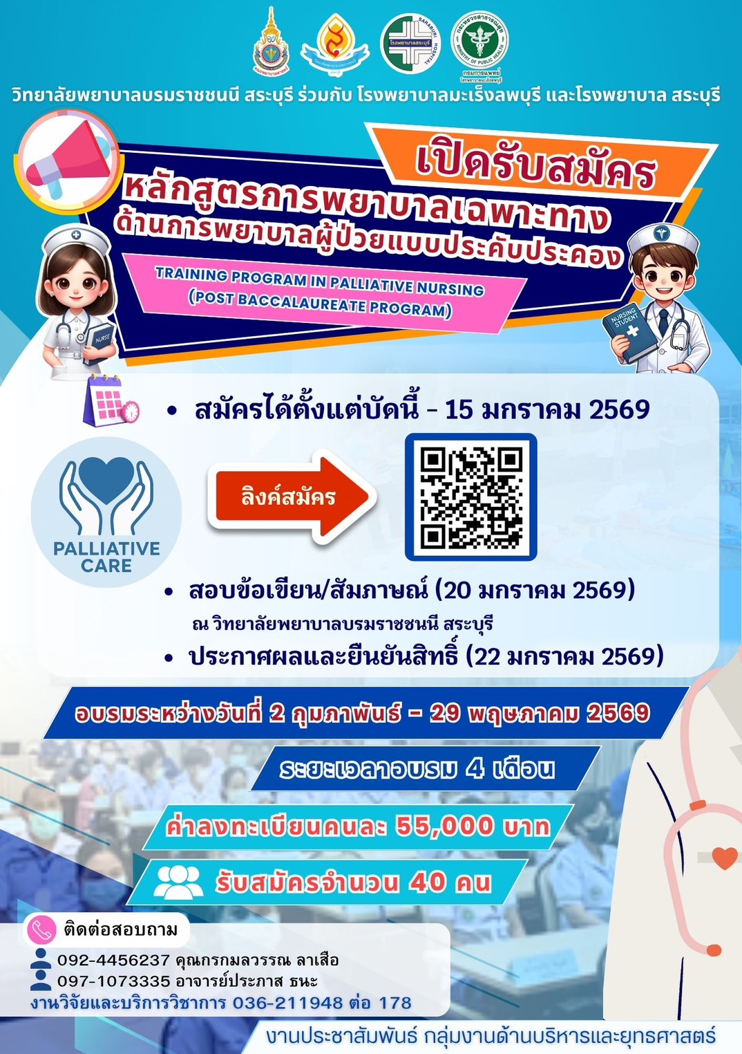 28 Oct 2025 เปิดรับสมัครหลักสูตรการพยาบาลเฉพาะทาง ด้านการพยาบาลผู้ป่วยแบบประคับประคอง อ่านเพิ่มเติม ดูทั้งหมด