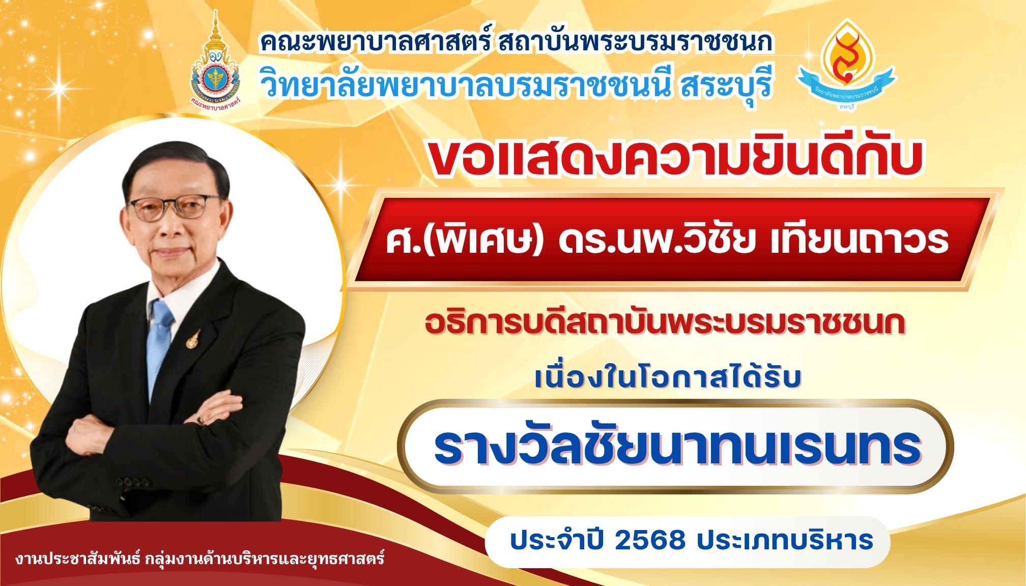 17 Oct 2025 ขอแสดงความยินดีกับ ศ.(พิเศษ) ดร.นพ.วิชัย เทียนถาวร อธิการบดีสถาบันพระบรมราชชนก ในโอกาสได้รางวัลชัยนาทนเรนทร ประจำปี 2568 ประเภทบริหาร อ่านเพิ่มเติม